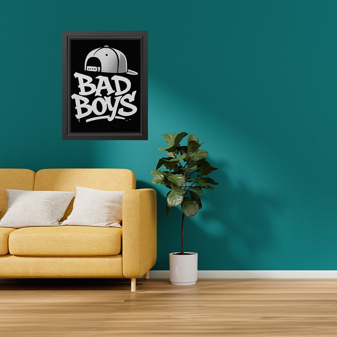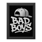 A bold black-and-white framed wall art featuring the phrase “Bad Boys” in graffiti-style typography, topped with a stylish snapback cap illustration. This design embodies a rebellious, urban, and edgy vibe — perfect for street culture enthusiasts, hip-hop fans, or modern wall décor.